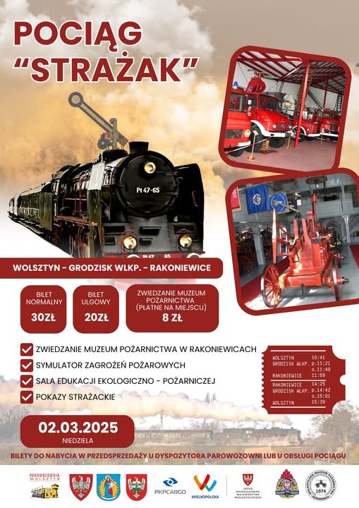 Wszystkich zainteresowanych przejazdami specjalnymi informujemy, że jeszcze w tym roku pociąg Strażak zawita do Rakoniewic. Chętnych zachęcamy do śledzenia mediów społecznościowych Parowozowni Wolsztyn oraz Wielkopolskiego Muzeum Pożarnictwa w Rakoniewicach.